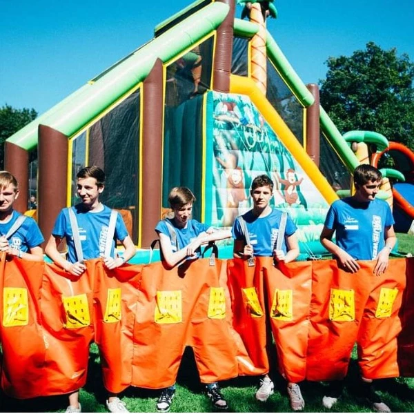 De loopbroek van 6 personen is in te zetten op verschillende manieren in een zeskamp of sportdag. Haal zo snel mogelijk de finishlijn, of loop een parcour met obstakels. Het huren van een 6 persoons broek blijft een succes! Kijk ook eens bij de zeskamp spelkussens.