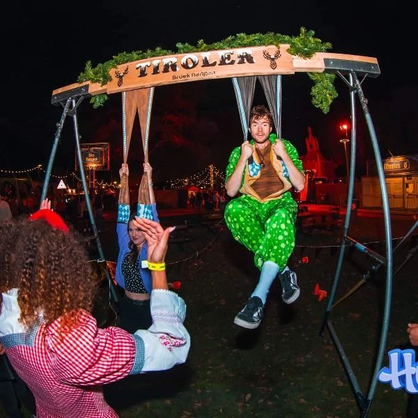 Wie blijft het langst hangen? De tirolerbroek hangen attractie is te huur bij ons. Er kunnen 2 personen tegelijk de strijd aangaan. Gemiddeld blijven spelers 20 - 40 seconden hangen, of kun jij langer blijven hangen?!