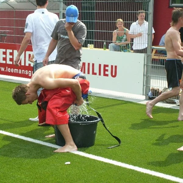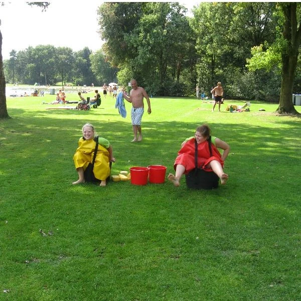 Een broek met op iedere bil een spons. Zak met je billen in de kuip met water, ren naar de finish en zorg dat het water uit je 2 sponzen nu in de andere kuip komt. Wie brengt zo het meeste water over?