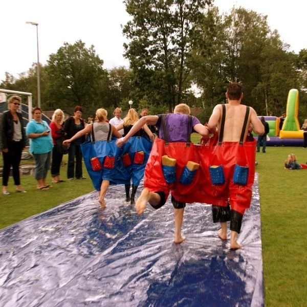 Een broek met op iedere bil een spons en met zijn tweeën aan elkaar vast. Zak met je billen in de kuip met water, ren naar de finish en zorg dat het water uit je 2 sponzen nu in de andere kuip komt. Wie brengt het meeste water over?