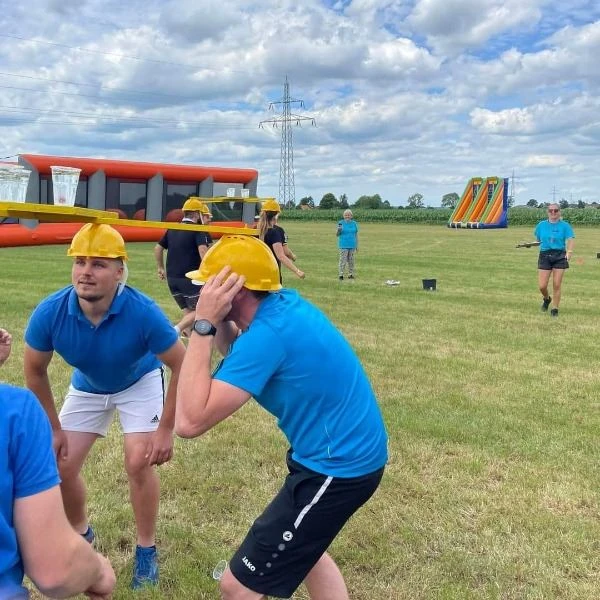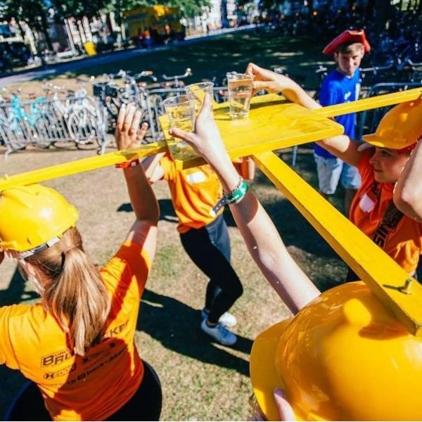 Vier deelnemers doen een helm op die aan elkaar verbonden zijn met een blad er tussen. Vul 1 speciekuip met water. Op het blad staan bekers die ze moeten vullen met water. Ren vervolgens naar de overkant en gooi het, overgebleven water, in de lege speciekuip. Balans houden en samenwerking is zeer belangrijk bij dit spel. Welk team heeft het meeste water over gebracht?