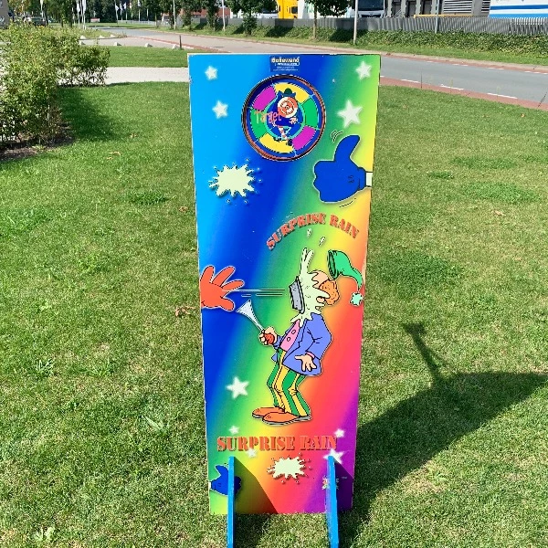 Leg een klein zakje snoep op het plankje aan de achterzijde. Laat de deelnemer een balletje gooien tegen de target aan de voorzijde. De arm schiet los en het bakje met snoep wordt over het spel heen naar de deelnemer toegeworpen. Werkt geheel mechanisch met een elastisch koord.