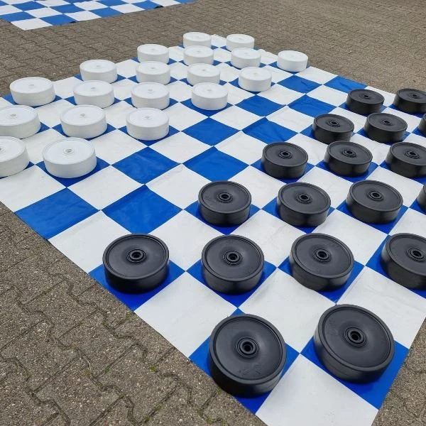 Het bord bestaat uit 100 vakjes, velden genaamd, in 10 rijen van 10, waarbij de velden afwisselend wit en zwart zijn. Er wordt gespeeld met damschijven. Dit zijn ronde schijven. Voor het spel worden 20 witte en 20 zwarte damschijven gebruikt.