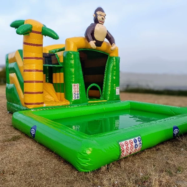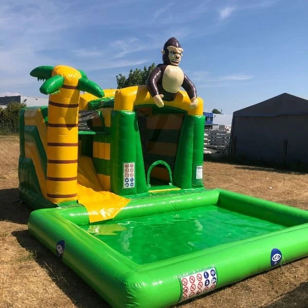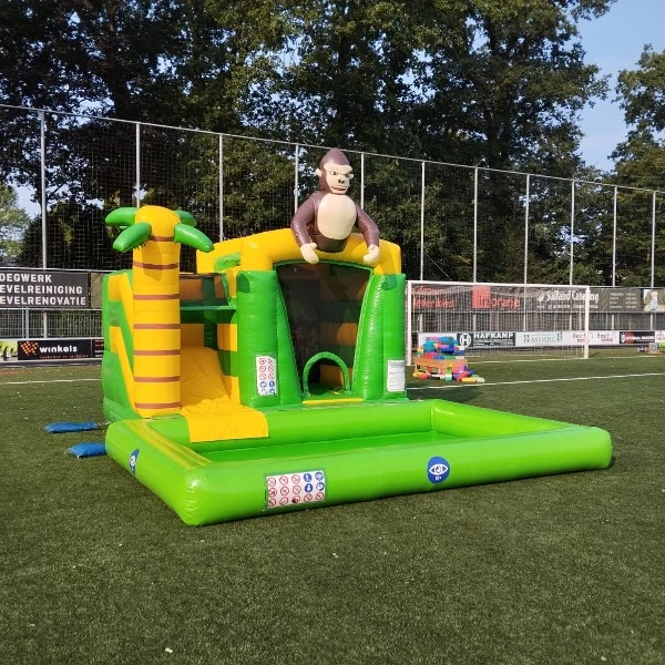 Een waterattractie huren voor de kleintjes? Huur springkussen aap met zwembad! Het huren van dit springkussen past goed bij een jungle of tropisch thema. Wanneer je de blower van het springkussen uit zet, blijft het zwembadje vol lucht doordat deze apart opgeblazen is. Springkussen aap met zwembad is geschikt voor kinderen tot ongeveer 8 jaar.