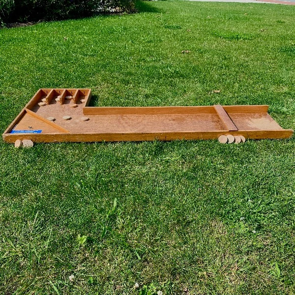 Probeer bij deze haakse sjoelbak de sjoelschijven door de bocht te krijgen richting het vak met de meeste punten! Net even anders dan een gewone sjoelbak huren!
