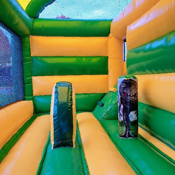 Ben je op zoek naar een indrukwekkend springkussen voor de echte dino fan, dan kan je niet om dit luchtkussen heen. Het springkussen Dino met overkapping en glijbaan is niet alleen superleuk om te zien, maar ook praktisch in gebruik. Dankzij het kleurrijke dino-thema en het speelse ontwerp trekt dit springkussen direct de aandacht van kinderen én ouders. Het dak biedt bescherming tegen felle zon én lichte regen, waardoor het springplezier nooit hoeft te stoppen.