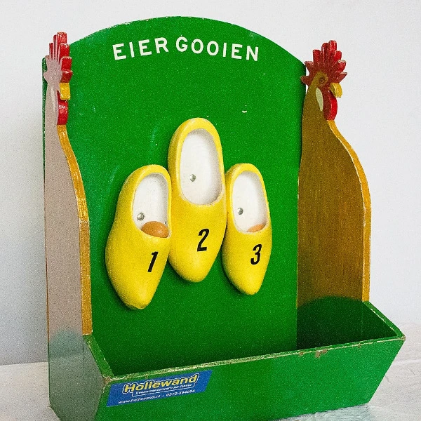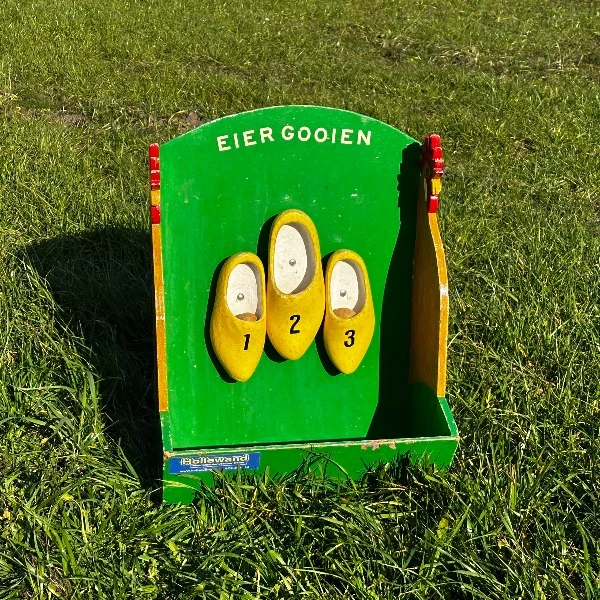 Probeer zoveel mogelijk punten te behalen door de eieren in de klompen te werpen. Een simpel maar, leuk oudhollands spel om te huren. Leuk voor feestjes met het thema boerderij of met Pasen.